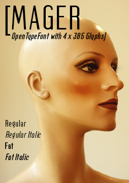 | filename | filesize | type | options | | Mager.png | 136 KB | Image | view | | Mager.otf | 26 KB | Font File | download | | Mager Fat.otf | 28 KB | Font File | download | | Mager Fat Italic.otf | 30 KB | Font File | download | | Mager Italic.otf | 28 KB | Font File | download | | Bitte lesen_please read.txt | 284 B | Text File | view |